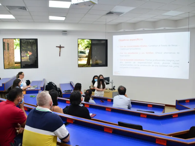 En un significativo acto de socialización, estudiantes javerianos de diferentes carreras participaron en la formalización de la entrega de la beca Fundación Bolívar Davivienda (FBD), un convenio de donación que se oficializó entre ambas instituciones desde el 2020, y que a la fecha se han beneficiado 48 estudiantes. Esta beca, hoy llamada 'Crédito al talento', está dirigido a estudiantes que estén cursando entre 5° y 8° semestre, de estratos 1, 2 y 3, y que presentan condiciones de vulnerabilidad que colocan en peligro la terminación de su programa académico.